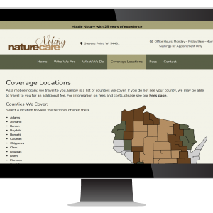 Nature Care Notary is a mobile Notary service who was looking to create an online presence. In 2020 we built them a mobile friendly website with a custom functioning coverage location system.